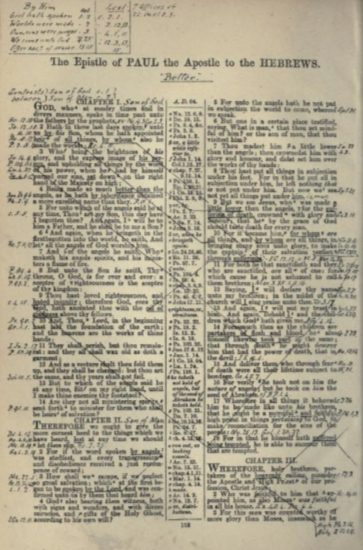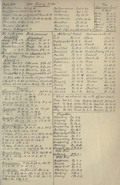 "It is at our brother Frank's suggestion that the accompanying facsimiles have been taken from my sister's Bible. She had thus referenced two of Bagster's Bibles, the Old Testament, as well as the New, showing her diligent searchings. Truly, her delight was in the law of the Lord, it was always her standard of appeal; and, by comparing Scripture with Scripture, she grasped its all-sided truth, rejoicing therein as one that findeth great spoil." To her niece Cecilia she wrote: